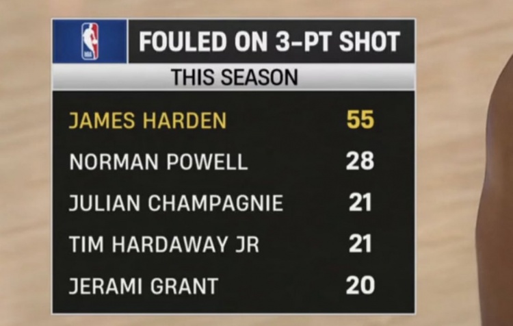 哈登 55次诺曼·鲍威尔 28次朱利安·尚帕尼 21次小哈达威 21次杰拉米·格兰特 20次...