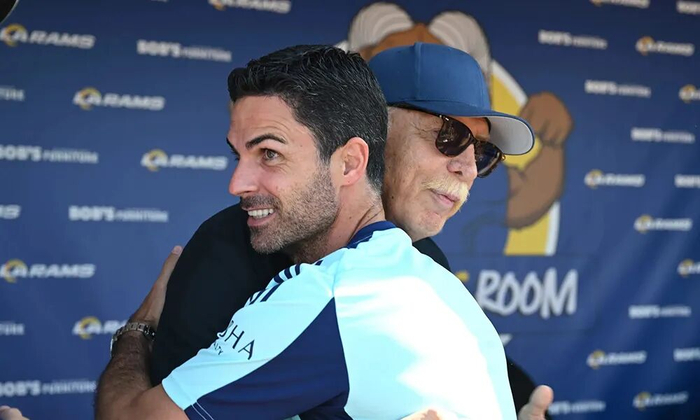 2024年7月26日,阿森纳足球俱乐部及洛杉矶公羊队所有者KSE集团的斯坦·克伦克(Stan Kroenke)与阿森纳主教练米克尔·阿尔特塔(Mikel Arteta)一同现身加利福尼亚州洛杉矶的洛约拉马利蒙特大学(Loyola Marymount University)洛杉矶公羊队训练营。图片来源:Stuart MacFarlane/Arsenal FC via Getty Images